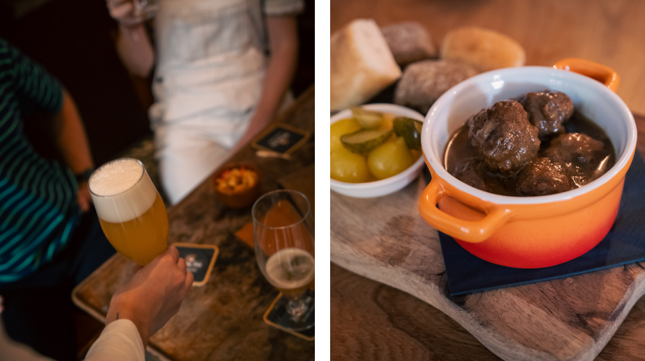 De kleine borrelkaart sluit naadloos aan bij het drankenaanbod. “We serveren Nederlandse kazen, worsten, brood, olijven – en natuurlijk onze huisgemaakte gehaktballetjes. Die zijn beroemd in Utrecht, ook in vegetarische variant, met een biersaus van Westmalle Dubbel.”